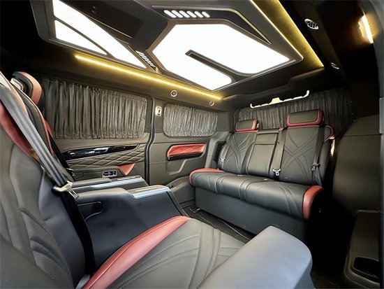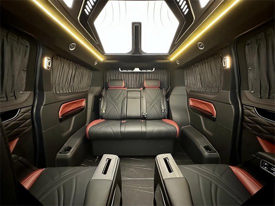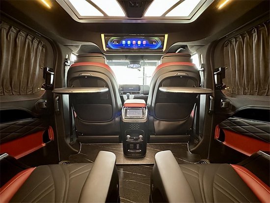 整车的顶部的顶灯是开模具生产的,一体成型,造型很不错,而且颜色是有多款可以调节的,有遥控器控制,在这亮度也能自己调节。整车 是经典的2+2+3的布局,中间两个很豪华的航空大座椅,通风,加热,按摩,旋转的功能全部都有,座椅是真皮包覆,乘坐的舒适感很强,座椅旁边也带有无线充电。整车的窗户上开了小窗,可以通风散气,而且都带有窗帘,日常车内很好的保护了隐私性,还能避免阳光的直接照射。