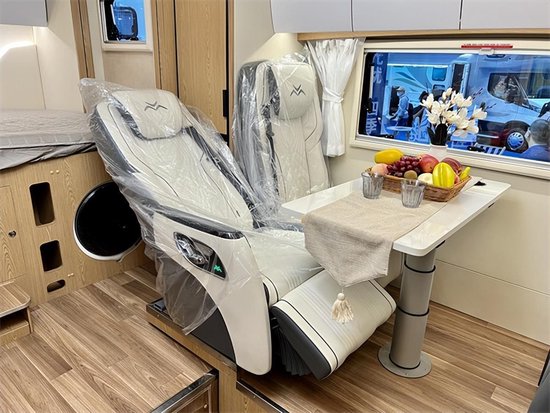 侧拓展区域对应车内的4人会客区,卡座沙发采用nappa皮包覆,座椅的横向长度为900mm,两卡座间距为730mm,可以满足四人同时落座的脚部活动空间。餐桌为机械折叠形式,必要时可转换为一张1870×945(mm)床铺。餐桌也带有向外延展的功能。 卡座后方是一款标配的赛特福德141.5升立式压缩机冰箱,冷冻冷藏单独设计,非常适合配置在国内的房车上。