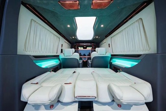 这款奔驰斯宾特是我们为客户专属设计打造,座位数7座,另外吧台处设计了两个翻折式隐藏秘书座椅可以作为辅助老板休息时放脚使用,或者需要环座时对坐。环座时还可以打开隐藏的滑动式秘书桌,临时开会或者打牌休闲娱乐十分方便。