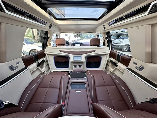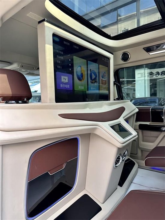 内饰部分,8英寸液晶仪表盘和8英寸中控屏幕放到现在来看已经没有多少科技感了,功能上,也不支持车联网和OTA升级,不过基本的卫星导航和语音识别控制却配备了,还可以选装车载电视,以拓展它的娱乐性。天窗、地板和座椅的改装很大,得益于勇猛者的大尺寸和大轴距,它的车内空间就十分有优势了,座椅布局完全可以参照高端SUV,比如它的2+3的5座布局就和大多数高端SUV车型一样,而且第二排座椅带腿托和电动调节,舒适性不错,前排座椅和第二排座椅标配座椅加热/通风,可以选装座椅按摩。