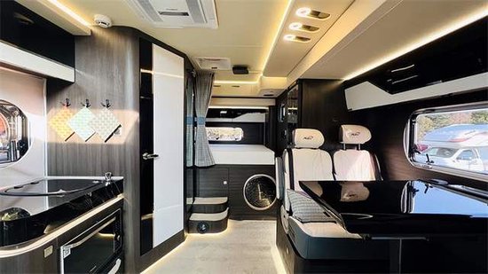 进入车辆内部,内饰布局方面遵循传统双拓展C型房车模式驾驶室顶端大尺寸额头床,后车会客区、休息区分列于两个拓展机构之上,对侧则是厨卫区,这也是注重整车配重的一个模式。