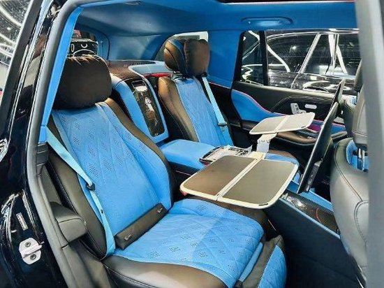 奔驰GLS450改装的迈巴赫GLS600,其中第二排独立座椅相比普通版GLS更加靠后,并且带有巨大的腿拖,其后排座椅最大倾斜角度大43.5度,后排腿部空间最大达1.34米。便捷式商务桌板,放置电脑、文件等物品。