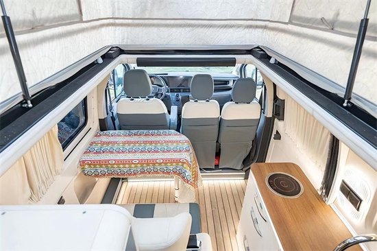 升顶采用X型剪刀式设计,在承重方面可负载150kg,这在国内升顶房车领域还是很难做到的。使用寿命更是达到了万次以上,车顶升起后,可以看到上方是一个尺寸较大的天窗,同时还具有防蚊和遮阳的功能。车顶材质采用了三层复合升顶帐篷,主要有涂层、防水层和两层保温隔热层,大大增加了车顶的保温性和防水性。