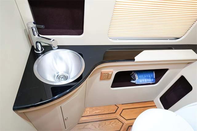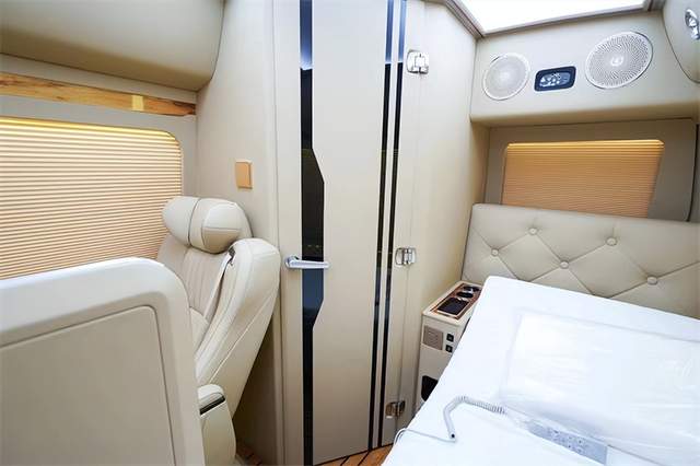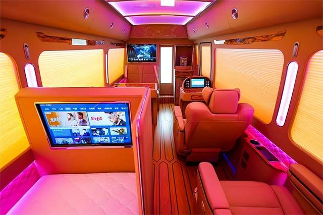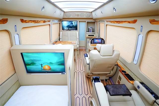 座椅采用埃尔法同款航空桌椅,有通风加热、座椅记忆、靠背调节等十项电动按摩功能,搭配三点式安全带,以及腿托、靠枕、小桌板。座椅旁配备无线充电基座、220V电源、水杯口和麦克风,电动窗帘由按钮一键控制升降
