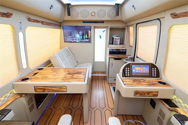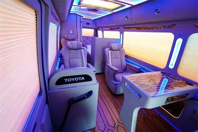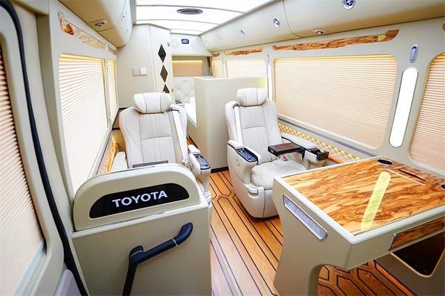 9座商旅款丰田考斯特车内设置外挂的空气净化器,采用奔驰涡轮出风口、镶嵌A380炫彩顶灯,设有桃木镜面办公桌和秘书台,安装32寸高清联网电视、丹拿音响、点歌台、红酒柜、冰箱和隐藏式储物柜,配备两把劳斯莱斯同款雨伞。