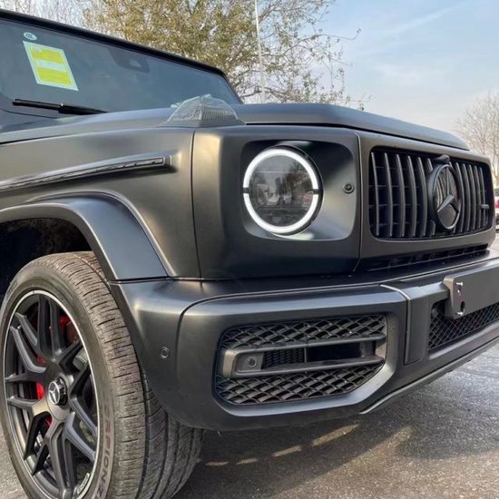 硬朗的方盒子外观不用多说,是奔驰G级 (配置|询价)经典的身材,全新的G63前脸采用直瀑式中网,更好的区别于普通G级,这也是AMG家族成员的标志,也进一步增加了G63的强大气场。外方内圆的大灯设计依然传承经典,全新G63更是加入了多光束全LED光源,复古式的转向灯立在机舱盖两侧,简单实用的设计已成为经典中的经典,LED大灯寿命更长光源更亮,照明效果更加出色,科技感也得到了提升。