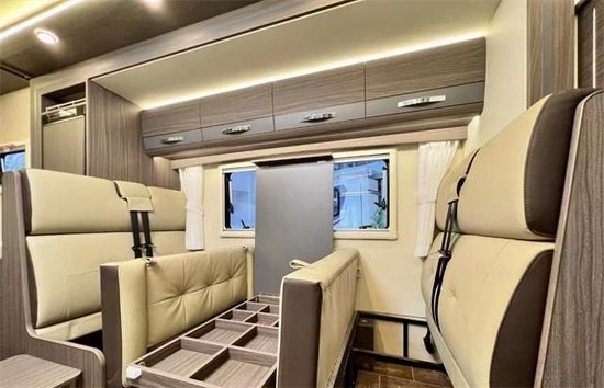采用进口依维柯new daily底盘,搭载3.0T柴油发动机8速自动变速箱,最大功率132kW,最高输出180马力,扭矩高达430牛米,配备ABS+ESP9.2车身电子稳定系统,多功能方向盘、10.5寸中控屏,六轮胎压监测及倒车雷达等,驾驶舱主副驾驶座椅,采用NAPPA真皮包裹,底盘还配备有空气减震系统,保证了长途行车时的舒适性。