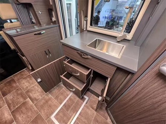 卫生间部分在全新E途pro max上依然很熟悉,酒店式卫生间,采用电动粉碎马桶以及智能马桶盖、不用自己去倒马桶。MAXX换气扇、顶部储物柜、侧窗、独立淋浴系统,尤其是带有固定的洗漱台和洗脸盆,而这一切设备也是当前C型房车中算的上最豪华的配置了。