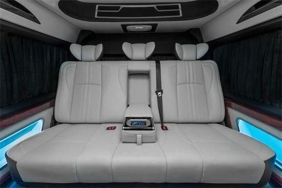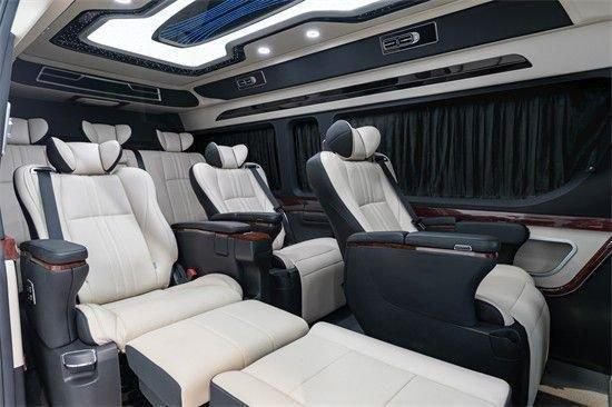 丰田海狮商务车海狮豪华版,车内搭配二个埃尔法航空座椅,通风加热按摩带腿托。景观车窗搭配咖色麂皮绒窗帘,高级奢华。