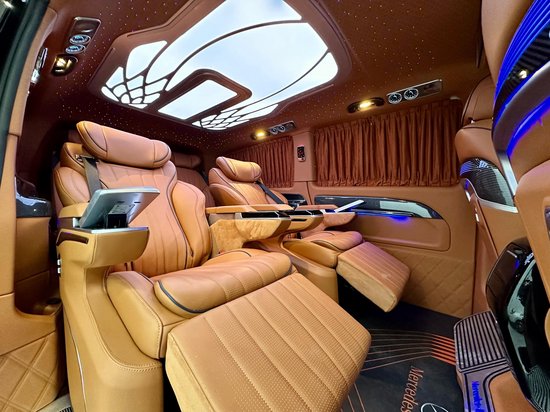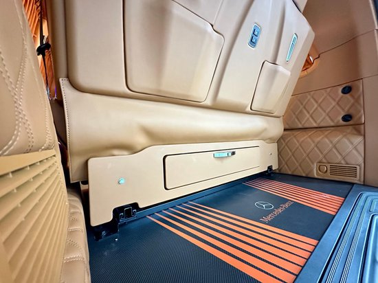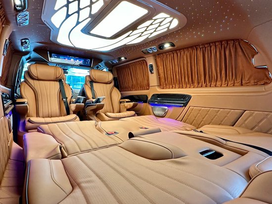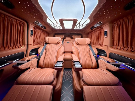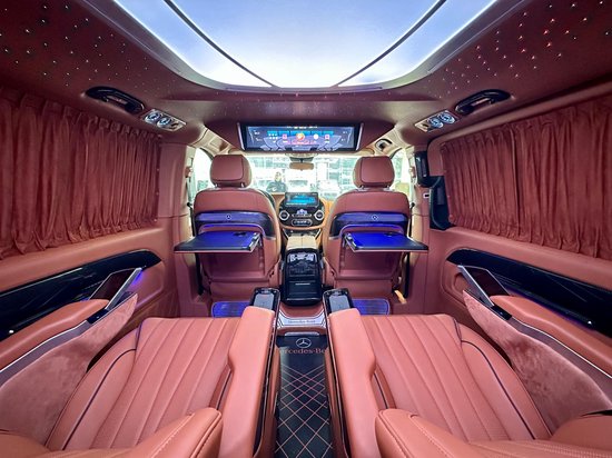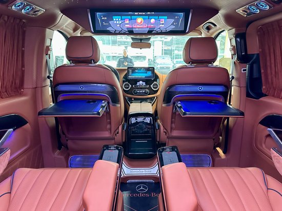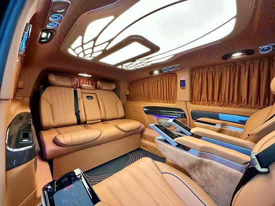 驾驶舱方面,首先进行整体升级包覆,包括中控台、方向盘、门板、扶手箱、正副驾驶座椅等,升级中控台的桃木件,中控屏升级成奔驰V级 (配置|询价)同款中控屏,加装扶手冰箱。并且可以选装升级了无钥匙进入,一键启动等高档配置。
