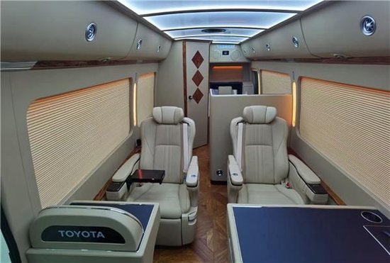 丰田考斯特车内的窗帘的设计上丰田考斯特也充分考虑了内饰设计的独特性,豪华的布艺窗帘以及大气的电动百褶窗帘,丰田考斯特改装商务车在内饰设计上充分展示出了自己大气的风格设计。