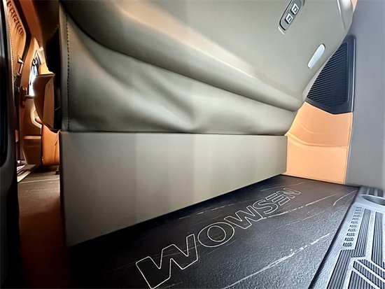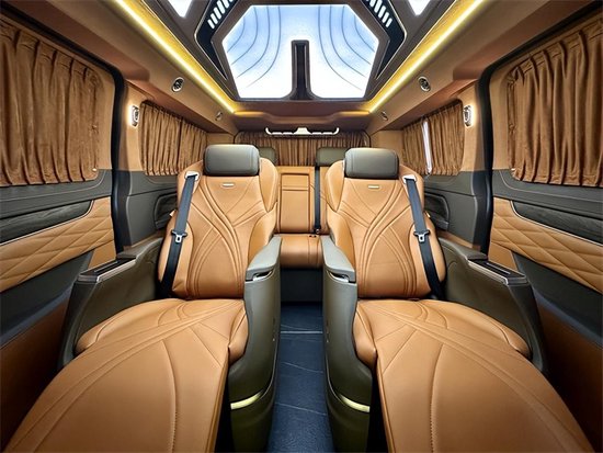 这款是深邃摩卡 (配置|询价)棕色的一个内饰搭配,也是四款颜色中公认的非常有格调比较大气的颜色。标准的去做MPV的布局2+2+3的座位数,整车还标配了,空气悬挂共有四档可以调节,以适应能够走不同的路况,乘坐的舒适感更强。配置方面也是相当的丰富,中央两排的航空座椅,多向的电子调节,双向的腿托支撑,座椅的无线充电以及座椅的按摩,旋转对做他都能够满足。全车搭配的是nappa皮质包覆,以及法式双缝线。在娱乐系统方面也配置齐全,车内有七个扬声器搭配的VV car影院级别的7.1声道的音响系统。娱乐设施的话电视机,我们可以满足