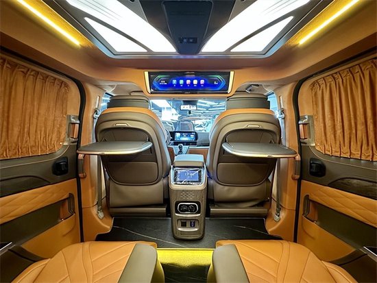 车子在音响方面也是做了大力的改造,用的是影院级别VV car7.1声道的音响并带有GPS处理器,光是扬声器的数量就有8个,坐在车内声学感受可以得到很大程度的提升。同时无线网络电视机在配合多色的幻彩氛围灯,以及独家定制的天幕顶灯,整体单从眼睛可触的方面来讲,他都会有着非常舒心的感受。这是一款视觉听觉都能够得到很好体验的商务车。