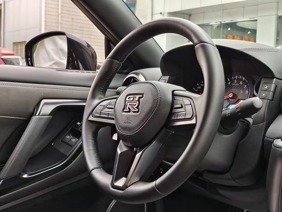 23款日产GTR三辐式方向盘采用全新样式的设计,相比老款时尚了不少,大小和粗细适中,握起来手感舒适,丰富的多功能按键可分别控制行车电脑,与定速巡航等信息。换挡拨片设计在方向盘上,可随其转动更利于操作,比之前固定在转向柱的设计好太多。仪表盘基本维持了老款的样式,读数简单清晰,信息也比较全面,中置转速表与碳纤维面板的点缀,更是增添了其运动气息,340kmh的刻度让人为之胆寒。
