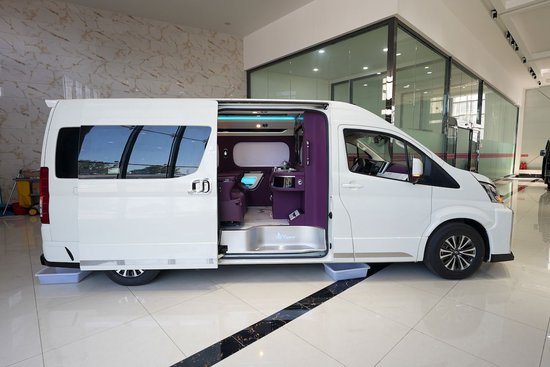 全新进口丰田海狮3.5L汽油改装商务车13座10座6座7座8座9座定制埃尔法原车座椅,隔断,实木地板,鹿皮顶棚,星光顶,冰箱,车载电视等等,采用了复古式的设计风格来致敬初代车型,与车身颜色不同的前保险杠、而A柱至D柱则采用了黑色涂装,以及白色抛边的轮拱。