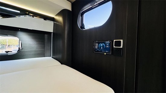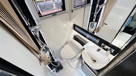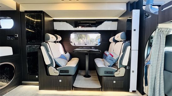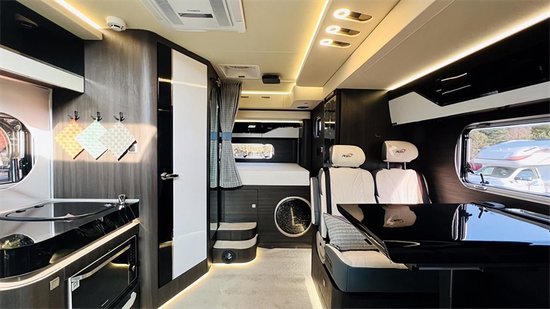 车身结构采用的是高强铝结构、电泳防腐车架,质量轻耐腐蚀。左侧配置三个不同规格的房车侧推窗、外推窗,给额头床、会客区、尾床提供采光通风。下方设有两个长条储物舱,尾部设有左右贯通式的储物舱,储物功能强大。整车外形尺寸为5990mm*2495mm*3200mm,最终质量为4498kg,核载6人,蓝牌C照就能驾驶。在水路方面,配置150L净水箱、80L灰水箱/40L黑水箱、美标食品级进口全自动水路、水箱加热防冻、15m外接水管等;电路方面,配置3000W充逆变一体机、450W的顶置太阳能板、240AH铅酸电池等。支持选配850W太阳能电池板、便携式发电机、洗衣机等。动力方面,该车搭载的是一款3.0T的柴油涡轮增压发动机,匹配8AT自动变速箱,最高车速可达120km/h。