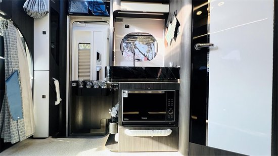 这款房车是双拓展设计,侧拓展延伸的空间相对比较大,后拓展相对较小,两个拓展全部打开后,大大提升了内部空间。车身墙板为厚度为四明治结构,这样的墙板可以起到保温、隔音、防潮等作用。这台房车采用流线型设计,大额头饱满,有效降低了风阻,提高了行车效率。