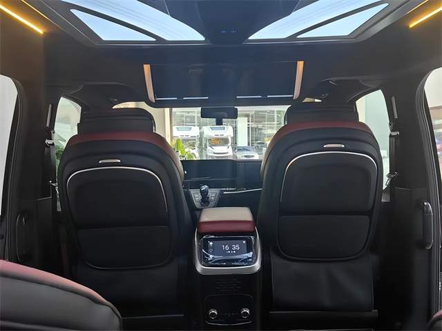 第三排座椅为标准的电动沙发座椅,支持一键放倒,可以通过隐藏在靠背中部扶手上的控制屏对座椅的靠背、腿托进行控制调节,必要时可以完全放平,形成一张豪华双人大床
