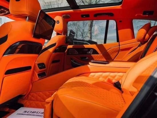 奔驰GLS450改装升级迈巴赫和巴博斯内饰整体皮饰改成了红米色的设计,替换了钢琴黑条纹桃木饰板,桃木方向盘,加装了HUD抬头显示系统,主机系统也刷了迈巴赫的开机画面,车内随处可见的迈巴赫标志,打造无出其右的考究质感。