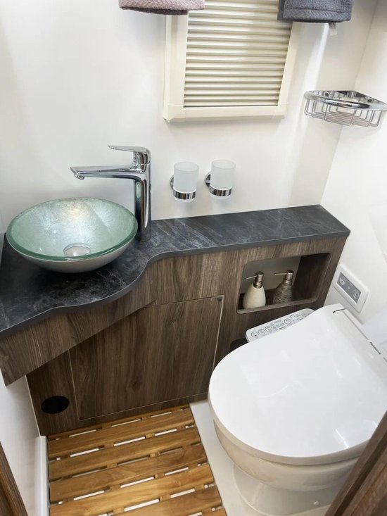 卫生间部分在全新E途pro max上依然很熟悉,酒店式卫生间,匹配智能马桶、MAXX换气扇、顶部储物柜、侧窗、独立淋浴系统,尤其是带有固定的洗漱台和洗脸盆,而这一切设备也是当前C型房车中算的上最豪华的配置了。车辆的水路配置也堪称豪华:330升保温双净水箱+80升保温灰水箱+90升黑水箱,超大水路保证优秀自持力表现。