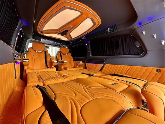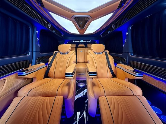 奔驰威霆改装后第二排座椅带有通风、加热、按摩、旋转、多向电动调节、豪华腿托、可折叠小桌板等功能。触摸的中控,使得座椅更具科技感,航空座椅的舒适感也很强。这款奔驰威霆的整体内饰以棕色为主,时尚大气不过时。车顶灯独特设计,氛围灯多彩可变,使得改后的奔驰威霆奢华感满满。第三排座椅也变成的三连排沙发床,可以180°放平,在旅途中可以轻松休息。升级后的奔驰威霆车窗也配有隐私窗帘,保证了车内的私密性。