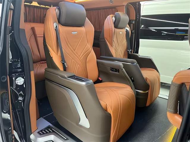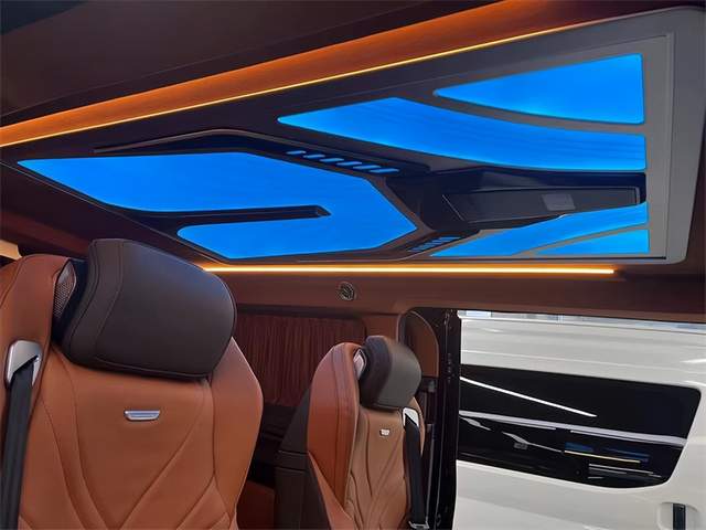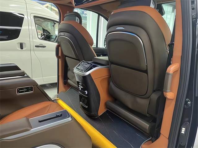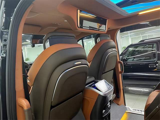 二排航空座椅具备通风,按摩,加热,旋转,腿托等功能,其中人体工程学6点为智能气动按摩,旅途的生活也能多一些享受与自在。三排电动调节,配有无线充电,它既可以是一个沙发床,也可以由两个独立的座椅所组成,可满足不同用车的需求。定制顶灯,有多种颜色可以调节,适应车内不同的用车氛围。