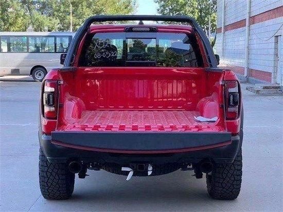 道奇公羊霸王龙传承了道奇Ram家族高大威猛的造型设计,同时细节部分融入了更多高性能元素,包括经过黑化处理的前格栅,引擎盖两侧的黑色进气口,以及为了容纳巨大的机械增压器而设计的通风口等等。此外,新车还配备了视觉冲击力更强的黑色轮眉和外露式的拖车钩,看上去十分霸气。