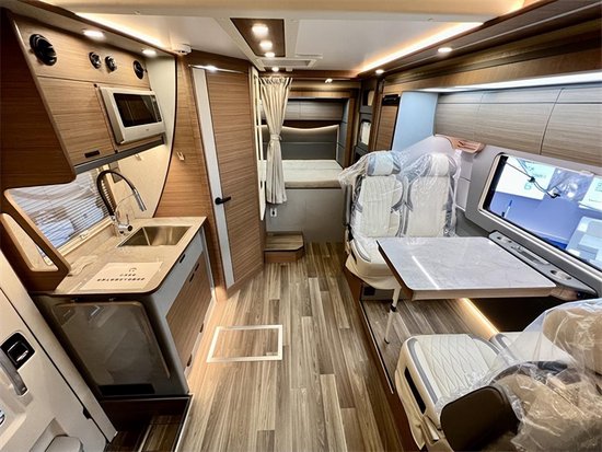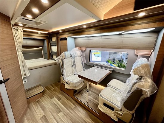 整车具体尺寸为5990*2470*3180mm,车身外侧配备有外置抽拉炉灶和外置桌板,顶部的进口菲亚玛遮阳棚,带来更丰富多彩随心所欲的旅途生活。车尾的贯通式储物行李舱能够带下更多的旅途物品,能够从车内直接拿取,避免上下车取物的麻烦。车内采用三菱的1.5P直流变频静音节能空调和伟巴斯特的进口驻车燃油暖风,方便驻车使用。还配备卡洛西进口行车冷风,增加驾驶的舒适度,为长途旅行奠定基础。车内采用中式的家居风格,棕色木纹加米色木纹的装饰,沉稳内敛符合大多数人的审美风格,会客厅部分采用的是对座式沙发卡座的设计,直径达到了1.95m,即便两个成年人对立而坐也不会碰腿。升降桌降下与对坐沙发可以拼成一张1900*945(mm)的临时床位。