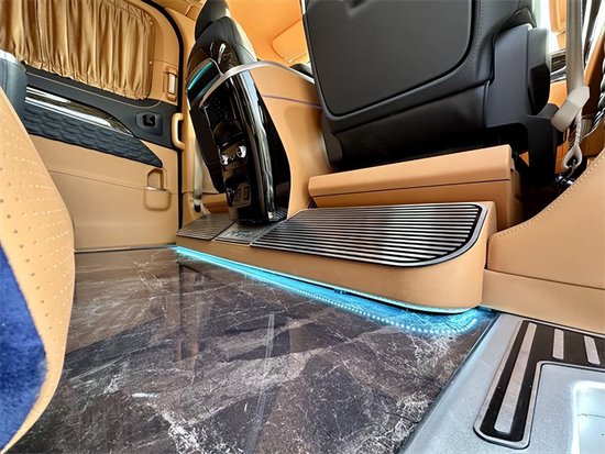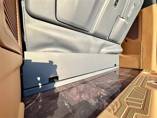 整车在配置上也很是舍得用料,全车都是真皮包覆从驾驶舱的门板到中控台到顶部,到门板到座椅都做了精细化的包覆。门板上的压花走线也非常的工整,体现了整台车子的品质与质感。整车还带有空气弹簧,行驶的过程中更加的平稳。驾驶舱中央扶手冰箱也都配备上了,还有无线充电和杯托。