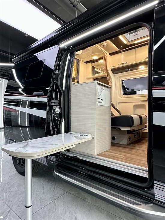 会客区采用了单排座椅+可移动带旋转副桌板的布局,将副桌板展开,与旋转后的副驾驶座椅形成一个更加完整的会客区,并且会客区座椅可以进行侧拉放倒,提供很不错的舒适性。侧面和顶部分别设计有侧窗以及天窗,整个生活空间自然采光充足。
