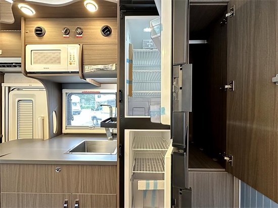 即使是在旅途,衣食住行也无需将就。厨房区位于入门处,操作台侧边设计有延伸桌板,可以增加烹饪时的操作空间。台面上内嵌有不锈钢带盖板式洗菜池,行车时也能清洗一些瓜果蔬菜。台面顶部安装有一台微波炉,时间紧迫或是操作不便时也能快速加热食物。碗筷厨具也有空间收纳,放进台面下方的储物柜中也能避免滑落。操作台右手边的大容量房车专用车载冰箱可以收纳更多食材。