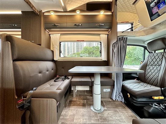 戴德自由风会客区采用L型卡座沙发,沙发配色和室内的地板以及灯光颜色融合的比较好。同时驾驶室座椅可向后旋转,与卡座沙发组成可容纳5-6人的会客区。另外,餐桌下方支腿为压力支腿,可以高低无级调节,桌面可随用户的实际需求来4个方向调节。