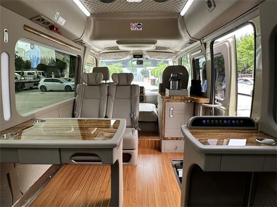 丰田考斯特改装商务车的改装设计不仅仅只是体现您的高贵身份,更是为了给给您的商务旅途带来方便,因此在设计上我们更考虑了您在办公中的所有需求。在车顶处添加LED灯,方便您在旅途中观看书籍或者工作材料。高档办公桌双人汇报新,并且配备了方便的电脑以及手机充电接口,方便而又安全。