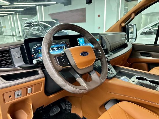 最新到店的福特黑武士内饰是经典的摩卡棕内饰,驾驶室依然是大连屏中控,科技感很强,液晶显示屏幕也更显得高大上一些。车内整体都是皮质包覆,驾驶室的座椅,包括操作台,同色系的包覆,触感很好,看起来也更有品质感。其次,驾驶座椅的靠背小桌板该有的配置一样不少,中央扶手冰箱冷藏的效果还是相当不错的。中央集成式的触控屏,灯光调节,无线充的开启关闭,以及香氛系统等,都在这上边操作。
