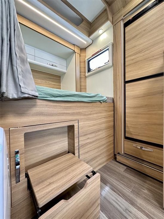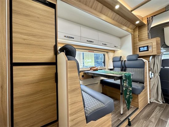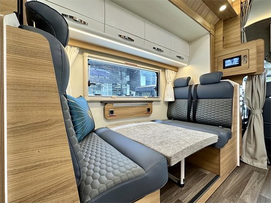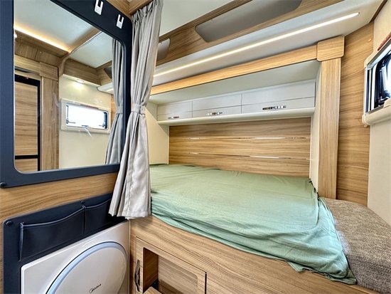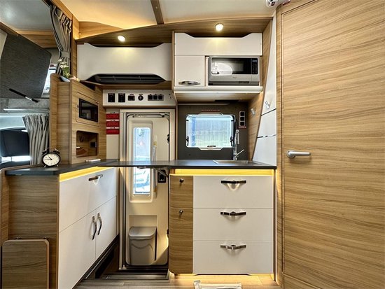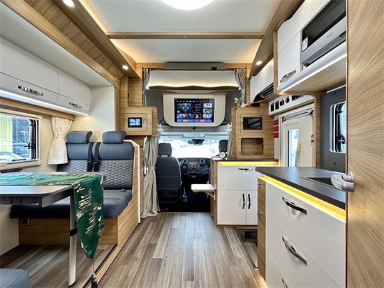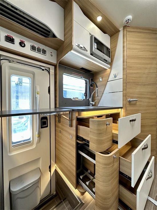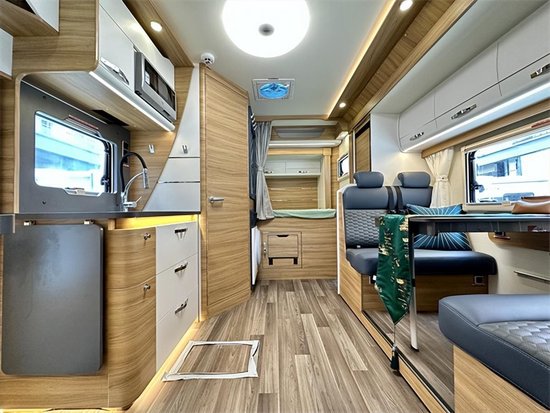 进入车内,内饰以枫棕色和米白色为主,加上顶部的环绕灯光,营造精致不失温馨的氛围。考虑到居住品质,本车采用环保轻量化板材,欧式结构及工艺制作家具,为车主带来高质量的旅居生活空间。车内布局清晰,前方为驾驶室、额头床,中部为会客区、厨房区,尾部为休息区、卫生间。