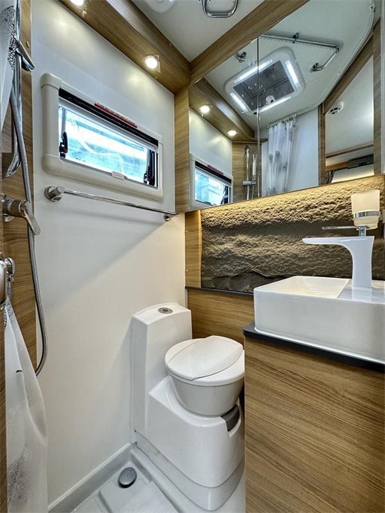 卫生间内部并没有完全采用纯白设计,而是将一侧的墙面装饰成峡谷风,增加观赏层次。内部配备有多美达抽拉马桶、独立淋浴系统、镜面浴室柜陶瓷方盆、漱口双杯架、加宽玻璃钢底托、房车专用带灯换气扇、折叠晾衣杆等。水路系统方面,配有300L净水箱+117L灰水箱。