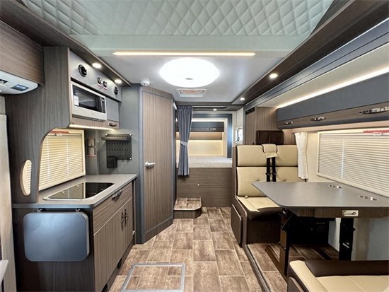 会客区为对卡座+升降桌的经典布局,整个区域位于侧拓展结构上,拓展结构向外展开后为车厢内部带来了更多的活动空间。座椅为真皮包覆,质感十足,侧面设计了两个延伸的小板凳,驻车时能够满足六人乘坐;休息时将升降桌降下可与卡座拼成一张临时床铺使用,1900×945mm的空间可供孩子睡卧使用。