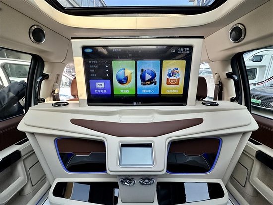 内饰部分,8英寸液晶仪表盘和8英寸中控屏幕放到现在来看已经没有多少科技感了,功能上,也不支持车联网和OTA升级,不过基本的卫星导航和语音识别控制却配备了,还可以选装车载电视,以拓展它的娱乐性。天窗、地板和座椅的改装很大,得益于勇猛者的大尺寸和大轴距,它的车内空间就十分有优势了,座椅布局完全可以参照高端SUV,比如它的2+3的5座布局就和大多数高端SUV车型一样,而且第二排座椅带腿托和电动调节,舒适性不错,前排座椅和第二排座椅标配座椅加热/通风,可以选装座椅按摩。