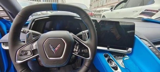 23款科尔维特C8敞篷 内饰部分采用了环抱式中控设计,中控台几乎将所有的控制按键和旋钮放置在了驾驶员右侧的面板上,并且全部朝向驾驶位置。此外,新车采用全液晶仪表盘与中控多媒体显示屏的连屏设计