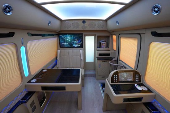 丰田考斯特改装车座椅数为7座,这是目前丰田考斯特改装很普遍的一项改装项目,完全根据客户要求定制座椅布局及座位数,出公告不影响正常上牌。车内豪华办公桌(带丰田标灯,桌上还配有无线充电底座,杯孔,纸巾盒)的配备以及秘书桌真皮包裹带抽屉和侧壁的多功能控制器,除此之外这辆车还带有一个平板和多功能控制器一起来控制车内各种功能的开启。 座椅是一水儿的埃尔法款航空座椅(此车的航空座椅电动调节首次研发转移到了侧壁上),带原装小桌板,能前能后能起能躺多向电动调节一键还原、加宽加大型、两侧加装固定扶手、扶手镶嵌桃木,座椅功能有座椅加热、座椅通风、电动座椅脚托两段可电动调节抬高或伸长,有杯架,头顶侧面有多功能挂衣钩,办公桌配备有两孔和三孔的220V供电接口以及USB口、HDMI高清接口。