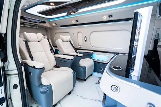 丰田海狮改装商务车内部采用米色为主色调的设计,看起来更加舒服。头等舱航空座椅具备通风、加热、腿托等功能,坐上去有一种陷进去的感觉,乘坐舒适性十分高。最后排的三连排电动沙发座椅是一键放的,带来了一个很好的休息区域,第一排座椅可以旋转过来,搭配隐藏小桌板就成为了一个临时的办公会议区域。车内也有着大量氛围灯光的点缀,使车内的豪华性与层次感得到更好的提升。