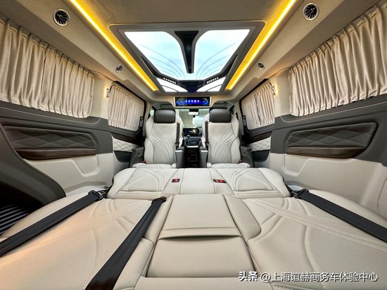 第三排座椅同样非常出色,采用电动电力沙发床,乘坐舒适性更加优秀,可一键放倒秒变沙发,全车搭载手机无线充电、220V电源、车载冰箱以及大尺寸多媒体显示屏,车内多色氛围灯以及优质音响配置样样俱全,高配版车型还搭载19寸熏黑运动轮毂,不管是内饰还是外观,该车都充分体现出了豪华感和霸气感,全黑色外观设计,大大提高了整车商务气息,非常符合公司接待使用,当然,这款车同样可以用于家庭用车,该车采用两侧电动侧滑门设计,大大提高了使用便利性,车窗搭载隐私窗帘,这些设计均符合商务用车理念。
