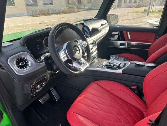 这台G63选配选了轮毂RG4 55.9厘米(22英寸)AMG交叉轮辐锻造车轮,搭配红色的卡钳、打孔刹车盘,相比原厂标配的轮毂气场更足,运动感也更强。这个轮毂是包含在夜色组件哑光版或者夜色组件豪华版里的,也可以单独选。