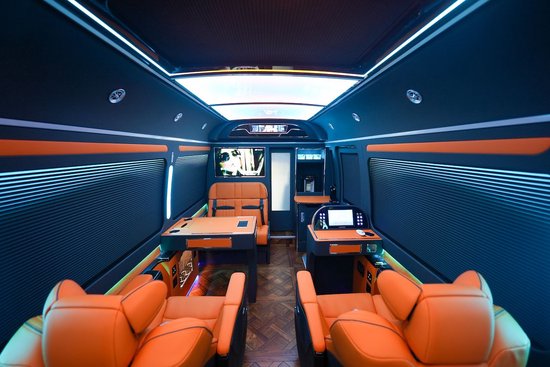 首先前面的车头完全就是一个埃尔法 (配置|询价)(配置|询价)的加大版,LED大灯开启竟然还有流水效果,配备有LED的雾灯。侧面看上去由于是白色的原因整车更是显得高大上,再配上特有的中国红世界地图彩条更是显得个性十足。 东方众威这辆丰田考斯特不仅配有电动航空外摆门,而且还带有自动向下伸缩的电动脚踏板,上面还配备了门槛迎宾灯,这种微不足道的细节设计最能体现高贵,东方众威也最能令人察觉到人性化的极致,并且车的侧面玻璃和天窗还贴了黑色的防爆玻璃膜。