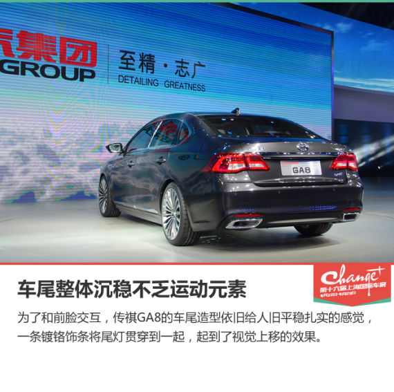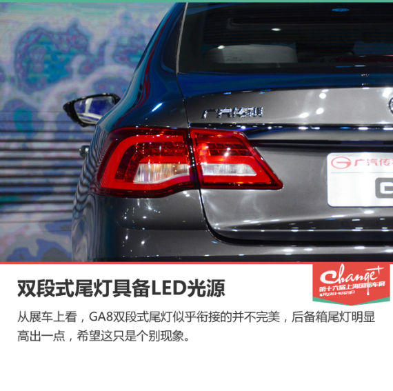 为了和前脸交互,传祺GA8的车尾造型依旧给人旧平稳扎实的感觉。从展车上看,GA8双段式尾灯似乎衔接的并不完美,后备箱尾灯明显高出一点,希望这只是个别现象。