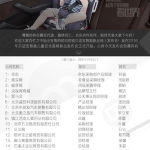 国产智能儿童安全座椅贝适宝线上发布会5.19在线上(微信群)正式发布,京东、我买网、蜜芽网、央视网商城、黑马会、北京威控科技有限公司、北京中润发汽车销售有限公司、北京奥之旅汽车销售有限公司、镇江艺高儿童用品有限公司、北京五元物流有限公司、贝贝网等公司出席了此次微信发布会活动。贝适宝CEO李仁宝先生向大家展示智能儿童安全座椅的三大智能黑科技功能,他们分别是儿童一键报警功能,车内环境安全监测功能以及驾驶者驾驶行为评测功能。