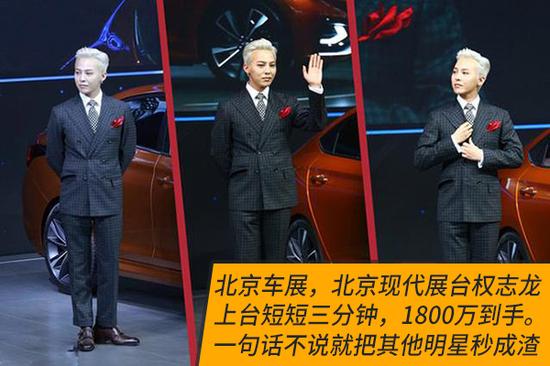 权志龙不到三分钟的费用是1800万元,平均每秒9.1万元。1秒就能挣9万块钱?!听完之后小编整个人都不好了。土豪的北京现代,你们的食堂还缺人吗?
