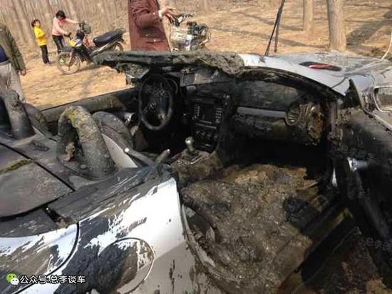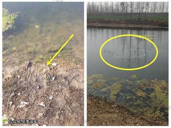 跑车就是从这个地方下去的,水面上有油花,大概就在这个位置,为了把这辆车“钓”上来,费了九牛二虎之力。小汽车、拖拉机和挖掘机都用上了。