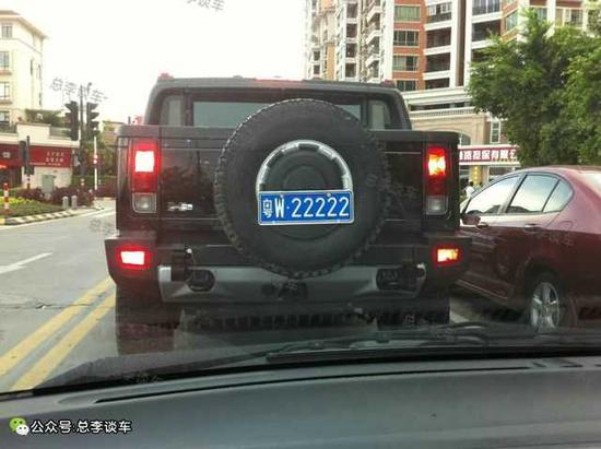 悍马H2粤W22222,这悍马是绝版车,因为停产了,这车牌如果拍卖,说不定也是价值百万。不过非拍卖车牌是谁的还不一定,比如下面这辆车!