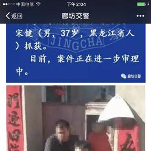 今日,法制晚报记者获悉,案发43个小时后,凶手被抓茯。发现,廊坊安次警方昨天在其官微“平安安次”通报,犯罪嫌疑人宋健己被抓获,案件正在进一步调查中。